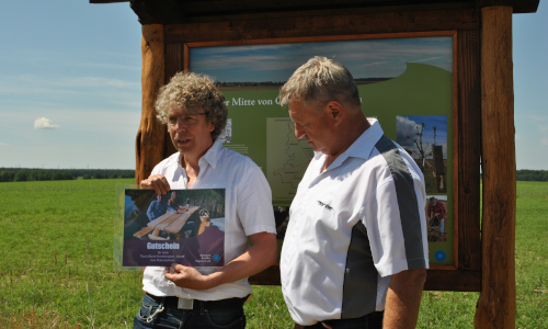 Amtsdirektor Thomas Kresse (re) und Andreas Bergmann, Geschäftsführer des Landschaftspflegeverbandes übergeben die Infotafel. © Mario Schrumpf
