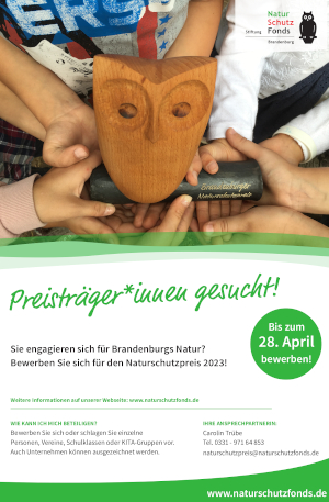 Die Stiftung NaturSchutzFonds Brandenburg lobt den Brandenburger Naturschutzpreis 2023 aus. Bis zum 28. April 2023 können Vorschläge oder Bewerbungen bei der Geschäftsstelle der Stiftung eingereicht werden. Den Gewinnerinnen beziehungsweise Gewinnern winken Geldpreise.