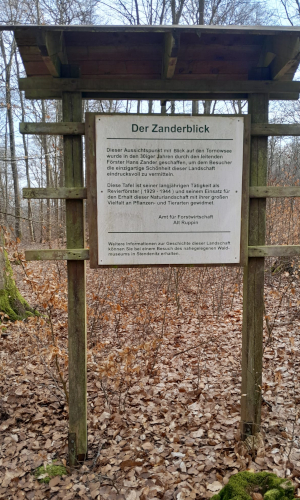 Die neue Tafel entstand als Gemeinschaftsprojekt des Naturparks mit der Oberförsterei Alt Ruppin (Landesbetrieb Forst)und dem Landkreis Ostprignitz-Ruppin.  Grafikerin Reta Flütsch gestaltete die Tafel mit vielen interessanten Informationen und Bildern zum von Revierförster Hans Zander um 1930 geschaffenen Aussichtspunkt.