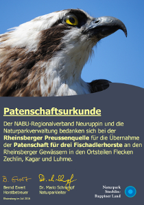 Am 14. Juli hat der Vorsitzende des NABU-Regionalverbandes Neuruppin, Bernd Ewert dem Geschäftsführer der Preussenquelle, Frank Stieldorf offiziell die Patenschaftsurkunde für drei Fischadlerhorste überreicht.