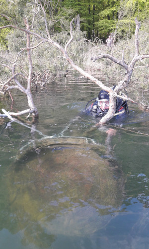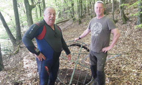 Der Sturm im Frühjahr 2022 brachte den Horstbaum zu Fall. Die Horstunterlage stürzte in den See. Mit Hilfe von Frank Kroll vom Tauchverein Nehmitzsee haben die Mitarbeiter des Heimatvereins Rheinsberg Robert Franck und Andreas Henschel diese geborgen.