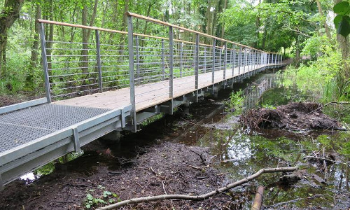 Weil der alte Holzsteg ziemlich baufällig und bei höheren Wasserständen nicht mehr passierbar ist, lassen wir als Ersatz eine langlebige und wartungsarme Stahl-Holz-Konstruktion errichten„, erklärt Inga Willecke vom Feuchtwälder-Projekt der Stiftung. Der neue Steg, der einen Teil des Dagowsee- bzw. Skulpturenrundwegs verbindet, kombiniert eine verzinkte Stahlkonstruktion mit einer Gehfläche aus verleimter Robinie. Ebenfalls aus Robinienholz wird der beidseitige Handlauf gefertigt. Flache Rampen ermöglichen eine barrierefreie Nutzung zum Beispiel durch Rollstuhlfahrer oder mit Kinderwagen.