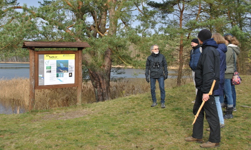 Neben ihrer eigentlichen Tätigkeit vor Ort in den Einsatzstellen treffen sich die Teilnehmer einmal pro Monat zur Weiterbildung. In Menz stand dabei der Besuch des NaturParkHauses Stechlin sowie eine Exkursion zum Roofensee im NSG Stechlin auf dem Programm. Die Teilnehmer waren beeindruckt von der Größe der Biberburg. Der Nager hat sich vor einigen Jahren am Fuße des Wallbergs angesiedelt.