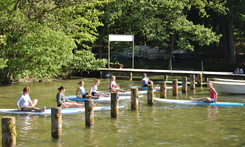 In den Monaten Juli und August lädt Yoga-Lehrerin Ines Riege aus Zehdenick  in Kooperation mit Peter Behnke vom Bootsverleih jeden Samstag 17 Uhr zum Yoga auf dem SUP-Board auf den Stechlin ein.