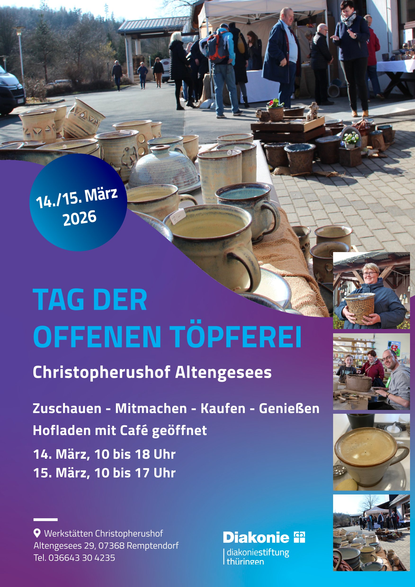 Unser Naturpark-Partner „Diakoniestiftung Weimar Bad Lobenstein“ lädt zudem ganz herzlich ein zum „Tag der offenen Töpferei“ in die Werkstätten Christopherushof in Altengesees, am 14. und 15. März 2026, ab 10 Uhr. Wie thüringenweit ist es auch hier möglich den Beschäftigten bei der Arbeit zuzuschauen, die Vielfalt der Produkte zu sehen und Schönes zu kaufen. Es gibt die Möglichkeit, sich selbst zu probieren. Kinder dürfen kreativ werden und mit Ton arbeiten. Am Töpfertag-Wochenende ist der Hofladen mit Café geöffnet. Es gibt Kaffee, Kuchen und einen Imbiss sowie eine kleine Auswahl des beliebten Werkstattwaren-Sortiments und mehr regionale Produkte.