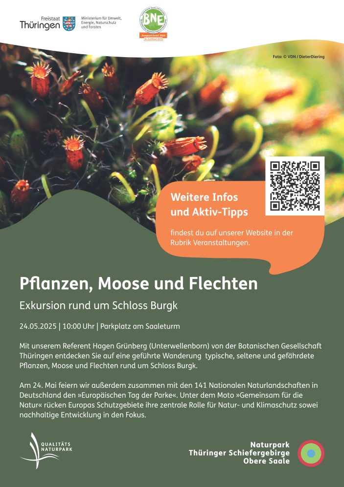 Mit unserem Referent Hagen Grünberg (Unterwellenborn) von der Botanischen Gesellschaft Thüringen entdecken Sie auf eine geführte Wanderung typische, seltene und gefährdete Pflanzen, Moose und Flechten rund um Schloss Burgk.