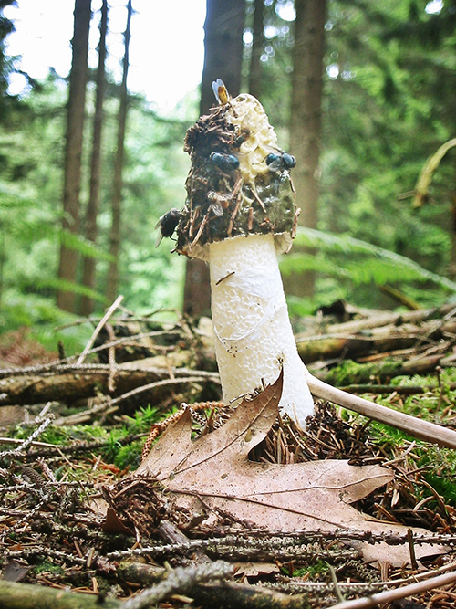 Diesen Pilz riecht man, bevor man ihn erspäht: Der Pilz des Jahres trägt seinen Namen nicht ohne Grund, denn am Hut der Stinkmorchel tropft eine übelriechende Sporenmasse langsam hinab, von der sich vor allem Fliegen, aber auch Mistkäfer wie magisch angezogen fühlen. Für die sensible Nase des Menschen ist der beißende Aasgeruch kaum zu ertragen – er lässt sich meist noch auf eine Entfernung von 20 bis 30 Metern wahrnehmen. Für die Insekten jedoch scheint der glibberige und dickflüssige Überzug, genannt Gleba, ein Festschmaus zu sein! Bis zum letzten Tropfen verspeisen sie ihn und scheiden die Pilzsamen anderenorts wieder aus – sehr zur Freude der Stinkmorchel, die damit ihre natürliche Verbreitung sicherstellt. Die Gemeine Stinkmorchel steht damit beispielhaft für die gegenseitigen Abhängigkeiten aller Lebewesen. Dies ist auch der Grund, warum die Deutsche Gesellschaft für Mykologie e. V. die Stinkmorchel zum Pilz des Jahres ernannte: Man möchte damit auf die Zusammenhänge beim Insektensterben hinweisen.