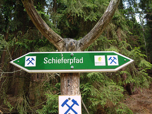 Der längste Themenweg im Naturpark wurde komplett mit neuen Wegweisern und Informationstafeln ausgestattet. In diesem Jahr erstellt die Verwaltung des Naturparks Thüringer Schiefergebirge/Obere Saale eine neue Info- und Wanderbroschüre für diesen 60 km langen Weg, der Thüringen und Franken verbindet. Gleich drei Naturparke und deren gemeinsamer Geopark „Schieferland“ tangieren den Pfad, der Wissen über den alten Schieferbergbau verbindet mit regionaler Geschichte, Museen und technischen Denkmalen der Schieferindustrie. Naturnahe Biotope am Grünen Band sowie schöne Aussichtsplätze inmitten einer unverwechselbaren Kulturlandschaft zeichnen den Pfad aus.