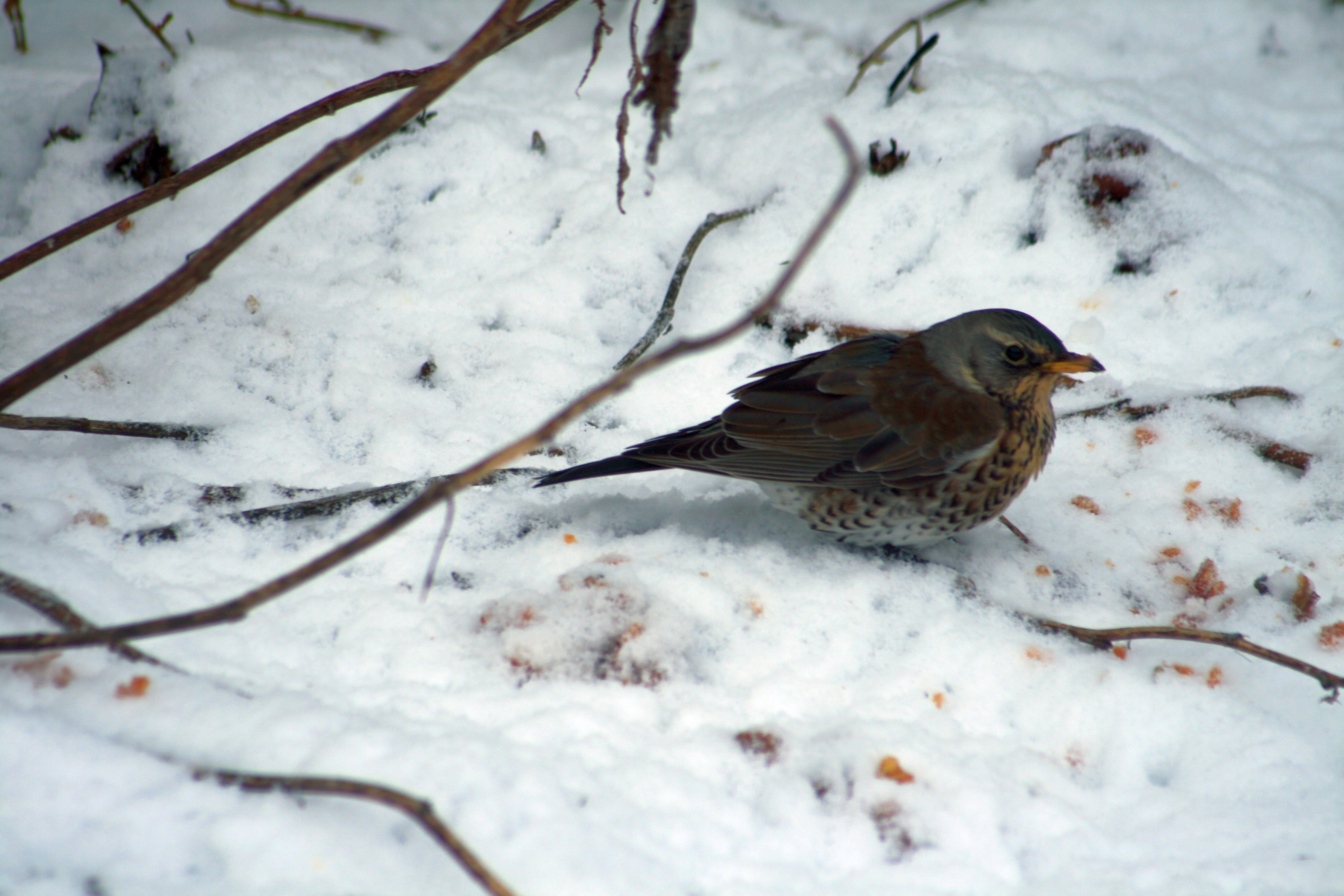 Wacholderdrossel im Schnee nascht an Äpfeln.