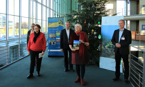 v.l.n.r.: Thomas Mertke, Naturwacht; Sylvia Lehmann MdB; Friedel Heuwinkel, Präsident des Verbandes Deutscher Naturparke; Claudia Roth MdB, stellvertretende Bundestagspräsidentin; Carsten Preuß, Leiter des Naturparks Dahme-Heideseen © Naturparkverwaltung Dahme-Heideseen