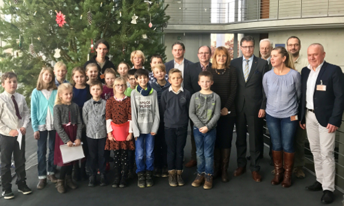 Schülerinnen und Schüler der Lichterfelder „Draußenschule“ haben mit selbst gebasteltem Baumbehang dem diesjährigen Weihnachtsbaum im Bundestag ein buntes Kleid verpasst und ein weihnachtliches Programm einstudiert.
