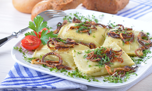 Den Nudelteig auf bemehlter Fläche zu einem Rechteck auswellen und in kleinere Rechtecke schneiden. Von der Füllung jeweils etwas auf eine Hälfte der Rechtecke verteilen, dann die andere Teighälfte darüber schlagen und erst leicht andrücken, damit die Luft entweicht, dann fest andrücken. In reichlich kochendem Salzwasser aufkochen, dann bei kleiner Hitze ca. 20 Min. gar ziehen lassen. Mit einem Schaumlöffel herausnehmen und abtropfen lassen.