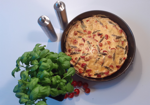 Dinkeltarte mit grünem Spargel und Schinken