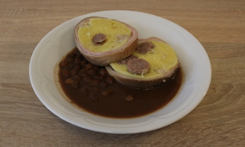 Während der Schweinemagen kocht, etwas Brühwasser entnehmen, in einen separaten Topf geben und mit Pflaumenmus auffüllen und aufkochen. Das Ganze mit etwas Mehlschwitze andicken. Die Whisky-Rosinen sowie einen Schuss Whisky hinzugeben und das Ganze mit einer Prise Salz, Zucker und Essig abschmecken.
