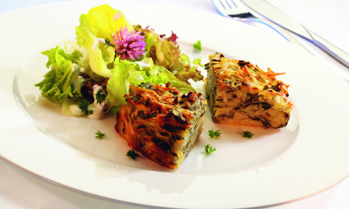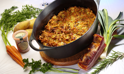 Kartoffeln schälen und grob reiben. Kartoffelmasse in ein Tuch geben und auspressen. Eier, die geriebene Zwiebel, Stärke sowie Salz und Muskat zufügen und gut durchmengen. Einen gusseisernen Topf gut einfetten und mit in Scheiben geschnittenen Speck auslegen. Abwechselnd Kartoffelmasse und Speckscheiben einfügen, obenauf sollte Kartoffelmasse sein. Im Backofen bei 200 Grad ca. 2 Stunden backen, bis eine schöne, braune Kruste entsteht.