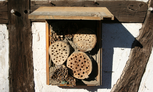 Einen Nistplatz für Wildbienen kann man sogar für die Terrasse bauen, denn im Gegensatz zu Honigbienen können sie uns nicht stechen und sind an unserem Essen nicht interessiert.