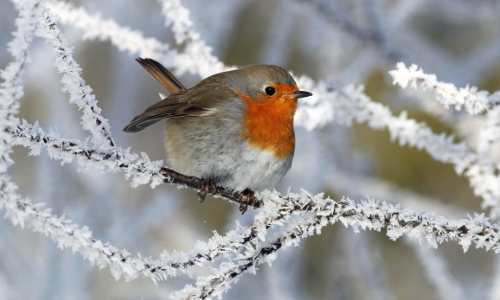 Mit seiner orangefarbenen Brust ist das Rotkehlchen leicht zu erkennen. Der Eiseskälte an diesem Wintertag im Naturpark Schwarzwald Mitte/Nord trotzt es, indem es sein Gefieder dick aufplustert. Im Winter ernährt sich das Rotkehlchen bevorzugt von Fettnahrung wie Fettfutter und Körner. Als zutrauliche Vogelart lässt sich das Rotkehlchen häufig an Futterhäuschen sehr gut beobachten.