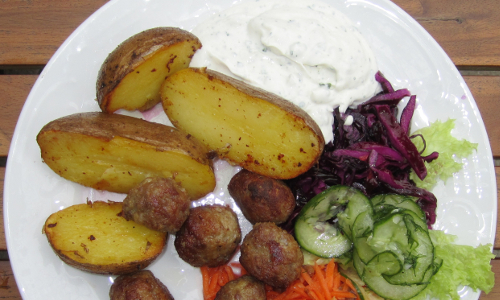 Die gut gesäuberten Kartoffeln halbieren und mit der Schnittseite auf ein eingeöltes und mit Salz und Kümmel bestreutes Backblech legen. Dann werden die Kartoffeln mit Öl bestrichen und großzügig mit Kümmel bestreut. Nun die Knieste im vorgeheizten Backofen etwa eine Stunde backen und zwischendurch etwa zweimal mit dem Öl vom Backblech bepinseln. Das Schweinegehackte auf einem Teller anrichten und mit den gewürfelten Gurken und Zwiebeln hübsch garnieren. Wer kein rohes Gehacktes mag, kann es auch lose gebraten zu den Kniesten reichen.