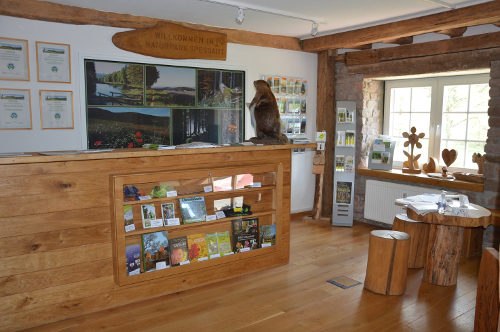 Auf 75 Quadratmetern Ausstellungsfläche können sich die Besucher über Freizeitaktivitäten sowie touristische und kulturelle Angebote informieren, viel Wissenswertes und Kurzweiliges zur Landschaft und Natur erfahren und regionale Produkte erwerben. Der Ausstellungsbereich im ersten Obergeschoss umfasst die Information und Präsentation von Angeboten und Produkten der Region. Den Schwerpunkt bilden Aktivurlaubsangebote wie Wandern auf dem Spessartbogen, den Spessartfährten und -spuren sowie Mountainbiken auf dem ausgeklügelten Tourennetz. Die Infotheke hält umfassende Prospekte und Karten bereit.