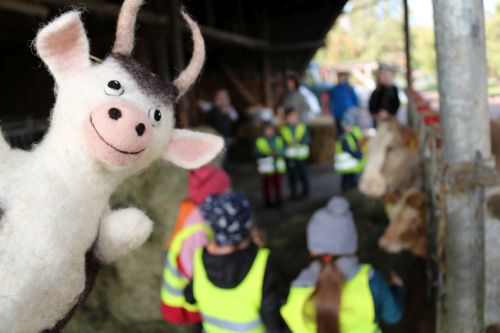 Wo kommt die Milch her? Wie wird Apfelsaft gepresst? Und was war zuerst da – Ei oder Huhn? Kindergarten-Gruppen lernen beim Projekt „Muh – die Kuh“ spielerisch, wie das Leben auf dem Bauernhof funktioniert und wie heimische Produkte zu uns auf den Tisch kommen. Zusammen mit der kleinen Handpuppe aus Filz erkunden schon die jüngsten Bewohner des Naturparks Bauernhöfe in ihrer Umgebung und lernen die Bauernfamilie und ihre Arbeit kennen. Ziel ist es, dass die Kinder während ihres Aufenthalts eine Beziehung zur Landwirtschaft, zu regionalen Produkten und zu einer gesunden Ernährung entwickeln.