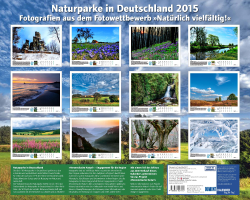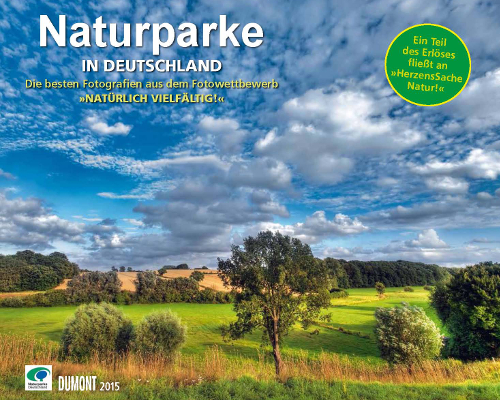 In Kooperation mit dem Verband Deutscher Naturparke hat der DuMont Kalenderverlag aus Köln jetzt einen Fotokalender für das Jahr 2015 herausgegeben. 12 Monatsblätter setzten mit jeweils einem Landschaftsfoto einen Naturpark aus den Bundesländern Schleswig-Holstein, Niedersachen, Mecklenburg-Vorpommern, Berlin/Brandenburg, Nordrhein-Westfalen, Hessen, Thüringen, Sachsen, Sachsen-Anhalt, Saarland/Rheinland-Pfalz, Baden-Württemberg und Bayern ins Bild. Dazu gibt es einen kurzen Steckbrief und Karte des jeweiligen Naturparks sowie Infos zu regionalen Besonderheiten.