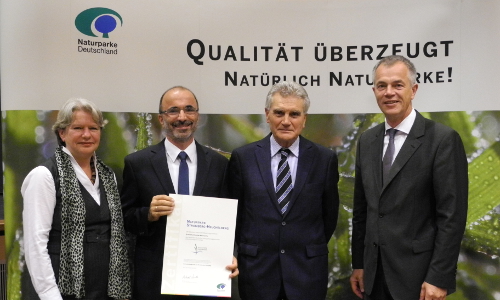 Auszeichnung des Naturparks Stromberg-Heuchelberg im September 2015 (von links nach rechts: Beatrix Tappeser, Staatssekretärin im Ministerium für Umwelt, Klimaschutz, Landwirtschaft und Verbraucherschutz des Landes Hessen; Dietmar Gretter, Geschäftsführer Naturpark Stromberg-Heuchelberg, Dr. Michael Arndt, VDN-Präsident, Johannes Remmel, Minister für Klimaschutz, Umwelt, Landwirtschaft, Natur- und Verbraucherschutz des Landes Nordrhein-Westfalen – Copyright: VDN