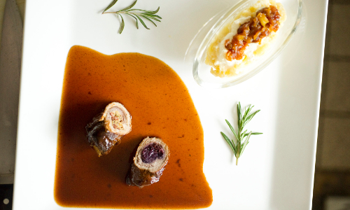Das Rouladen-Duett vom Überläufer ist gefüllt mit Wirsing und Rotkohl. Dazu wird Kartoffelstampf mit Apfel-Quitten-Chutney gereicht. Das Rezept des Monats Dezember entstammt der Küche des Parkhotels „Emstaler Höhe“ aus Bad Emstal und ist entnommen aus dem Buch „Märchenhafte Schmeckerlüste“.