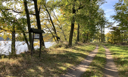 Weiter geht die Wanderung durch den Heiligen Hain bei Prestewitz. Dieses eher unbekannte Kleinod im Naturpark ist ein Wäldchen, das sich an eine Erhöhung anschmiegt und dem Wandernden so immer wieder schöne Ausblicke auf die Flussschleifen der Kleinen Elster ermöglicht. Bei einer Pause auf einer der Bänke kann man dem entspannenden Rascheln der Blätter lauschen – oder ist es doch das Raunen der Götter, wie es die Legende besagt?